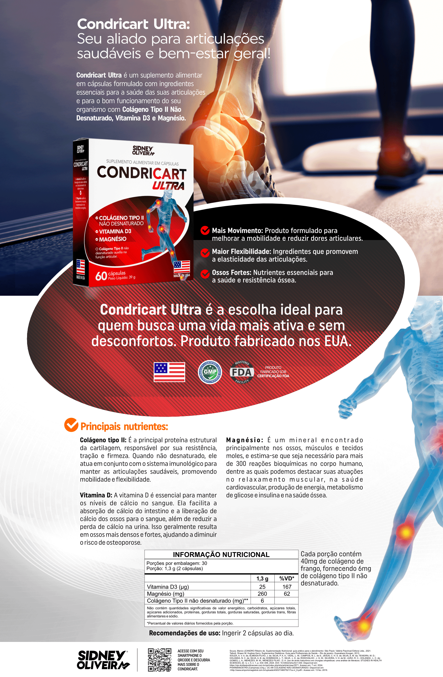 Informação nutricional: Porções por embalagem: 30– Porção: 1,3 g (2 cápsulas) – Por: (1,3 g, %VD*); Vitamina D3 (25 µg, 167%); Magnésio (260 mg, 62%); Colágeno tipo II não desnaturado 6 mg. Não contém quantidade significativa de valor energético, carboidratos, açúcares totais, açúcares adicionados, proteínas, gorduras totais, gorduras saturadas, gorduras trans, fibras alimentares e sódio. *Percentual de valores diários fornecidos pela porção.