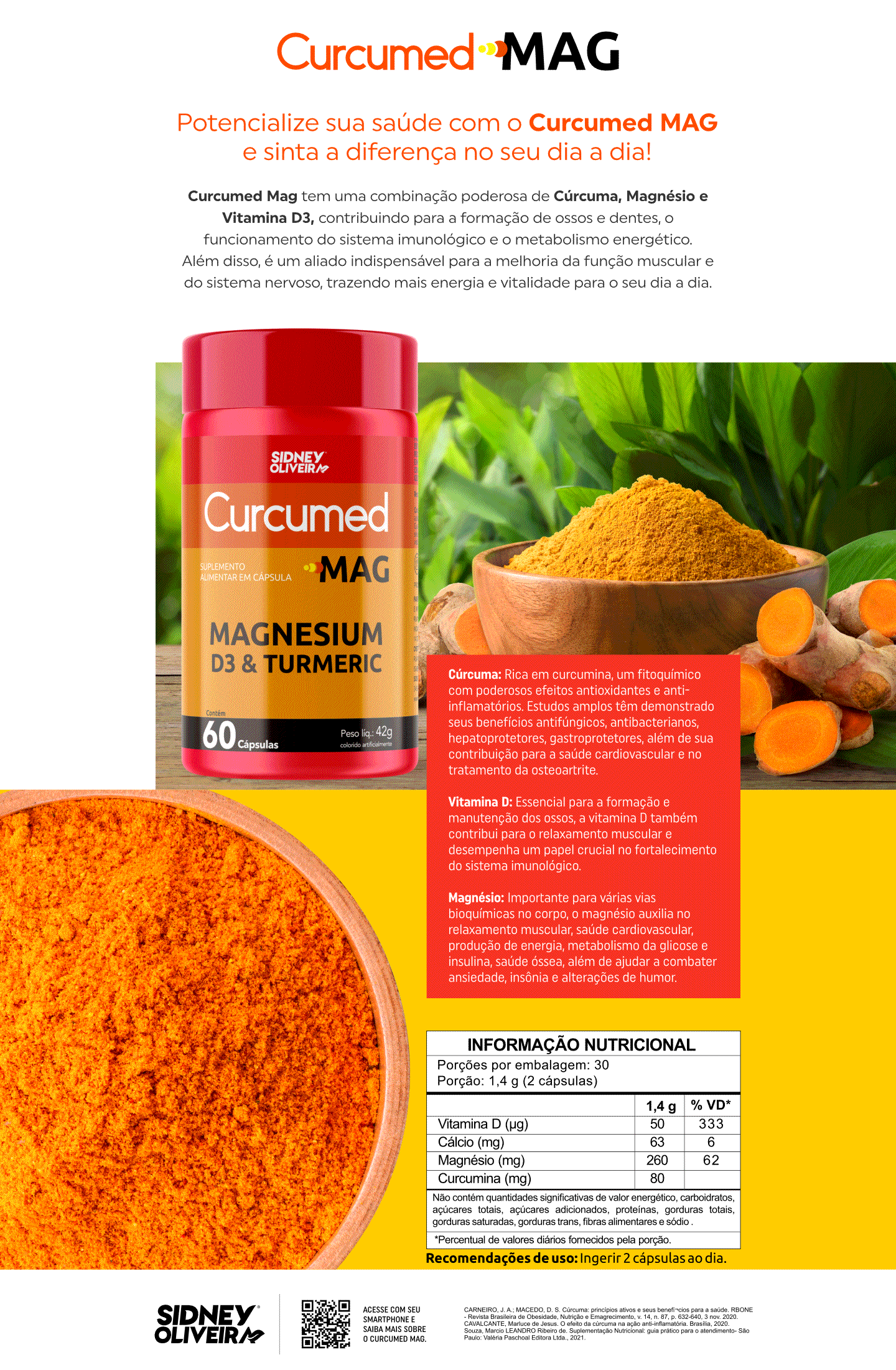 Curcumed Mag é uma combinação poderosa de Cúrcuma, Vitamina D, Magnésio e Cálcio em cápsulas.
